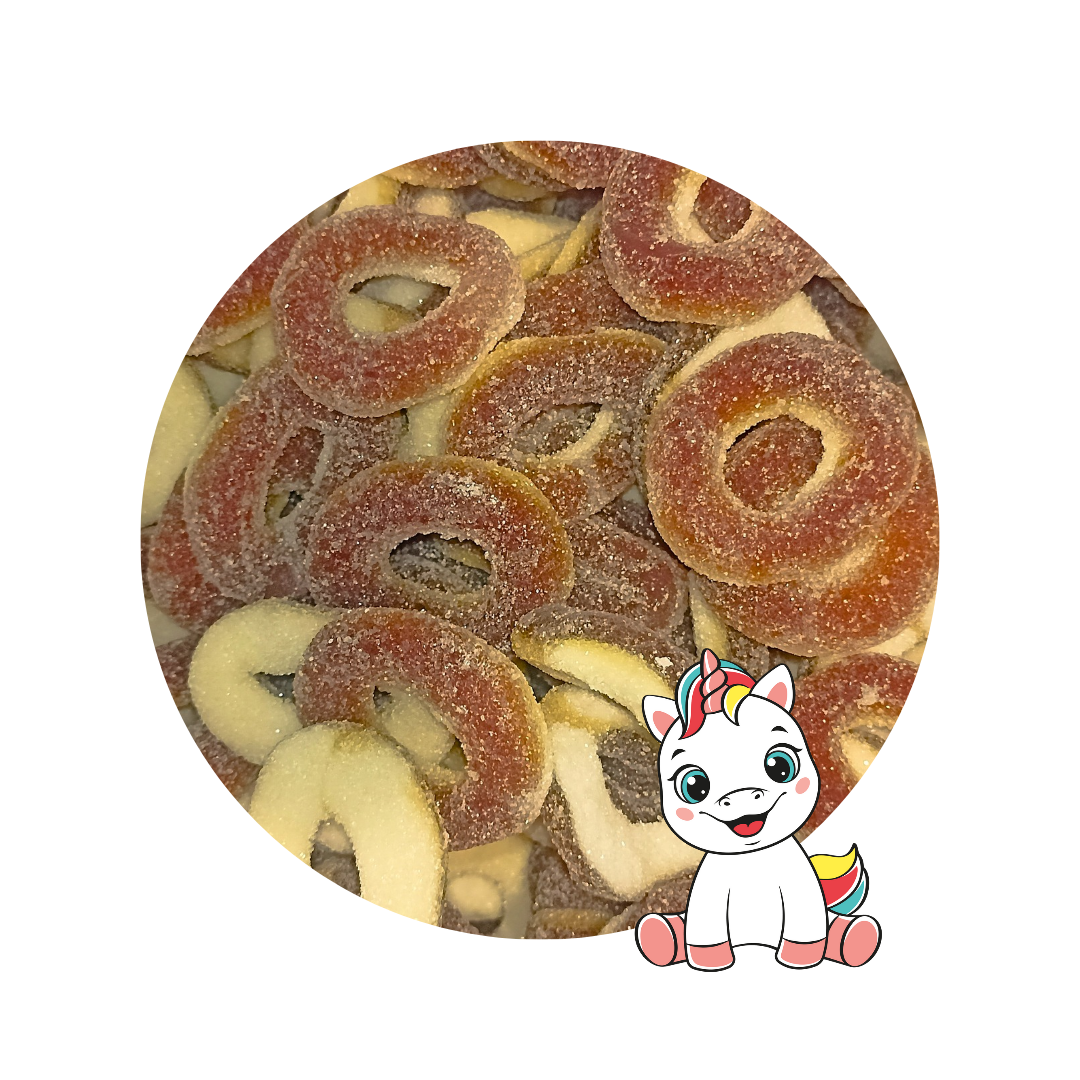 De petits cercles brillants, brun ambré, parfois légèrement translucides, qui évoquent instantanément le goût iconique du cola. Leur texture moelleuse et légèrement acidulée fond doucement en bouche, libérant un parfum caramelisé, avec des notes de vanille et d’épices secrètes. Ces anneaux sucrés et pétillants capturent toute l’effervescence et la gourmandise d’une boisson gazeuse classique, offrant un plaisir instantané à chaque bouchée.