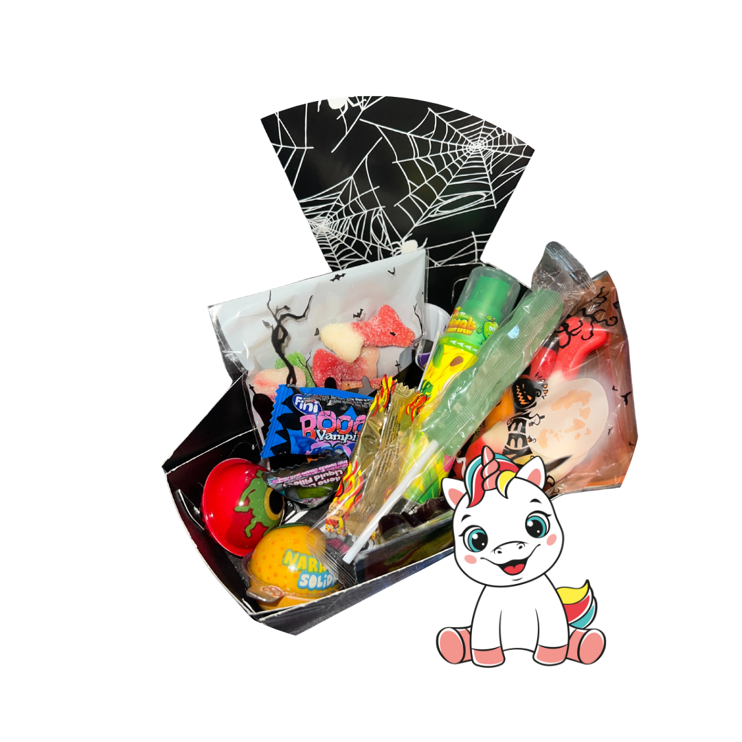 Une boîte terrifiante et gourmande remplie de surprises : • 1 sucette doigt • 50 g de bonbons acidulés • 50 g de bonbons lisses • 1 spray acidulé • 1 œil 3D + 1 orange 3D • 4 mini bonbons et chewing-gums piquants • 1 Jelly Insectes • Et une petite surprise mystère dans un cercueil réutilisable ![]()
