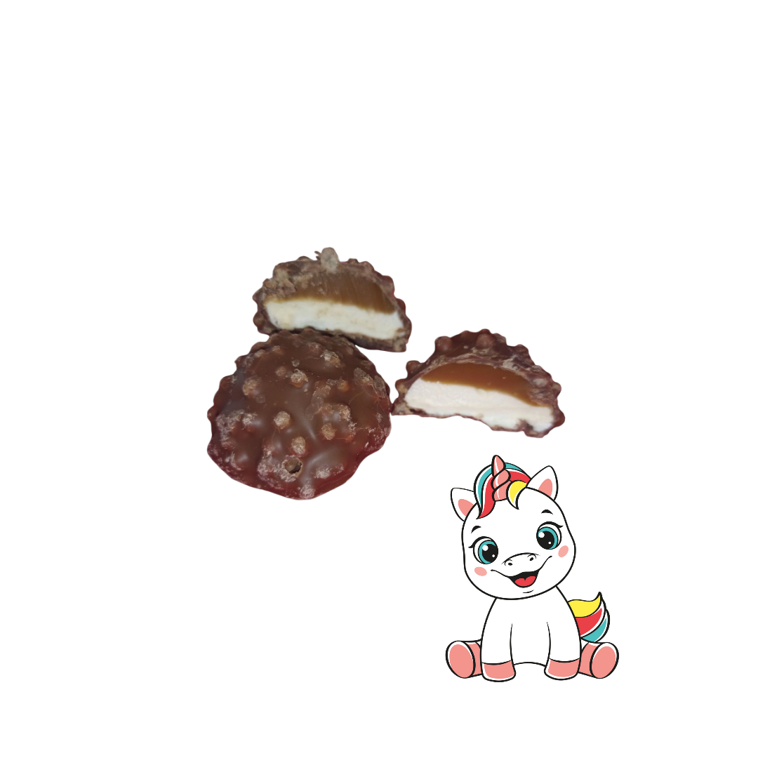 Le vrai petit hérisson croquant et moelleux en guimauve au coeur de caramel et enrobées d'un délicieux chocolat au lait incrusté de grains de riz soufflés.