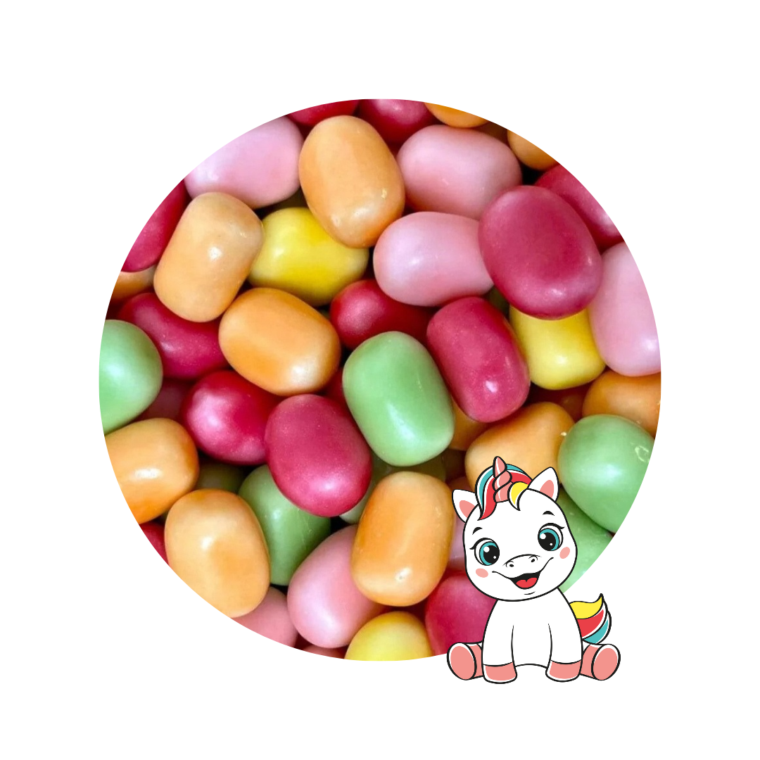 Ces petites bouchées colorées renferment un cœur moelleux et fruité sous une fine coque croquante. À chaque bonbon, une explosion de saveurs gourmandes — fraise, citron, orange, pomme, framboise… un véritable festival fruité !