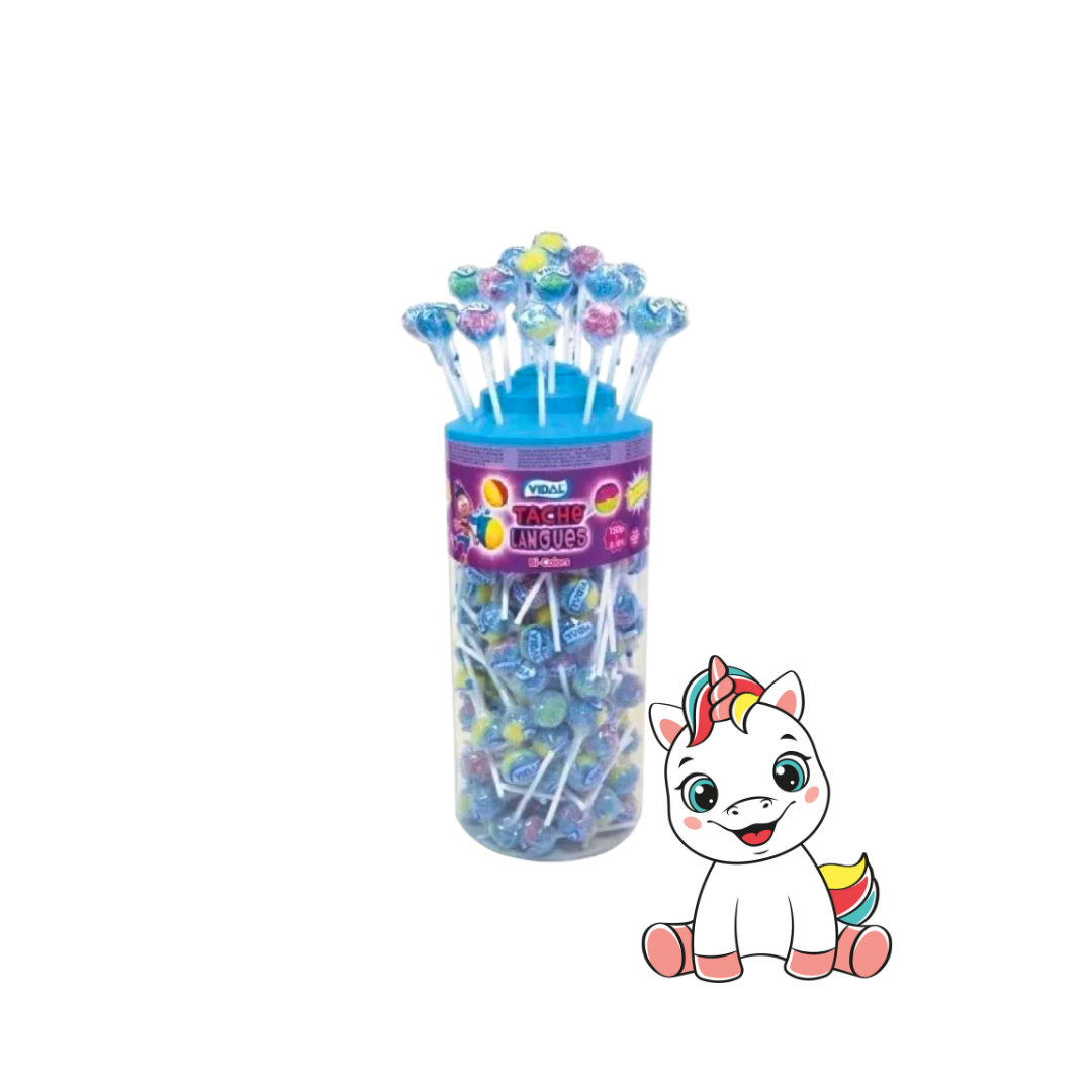 Sucettes bicolores qui colorent la langue en rouge, vert ou bleu.